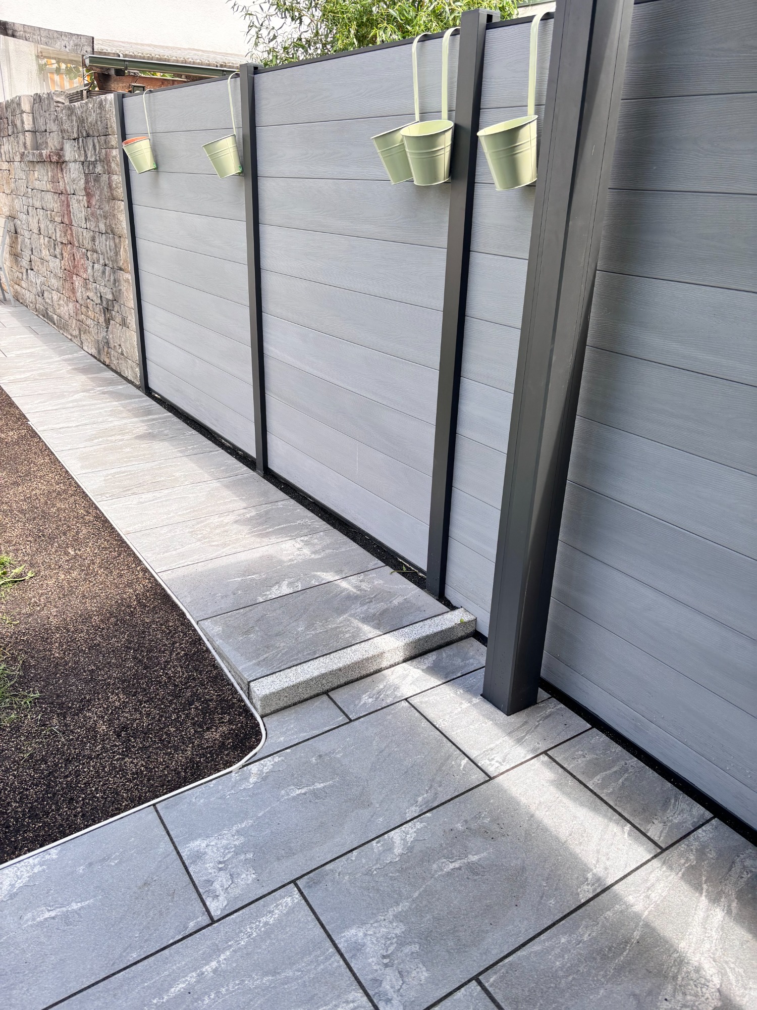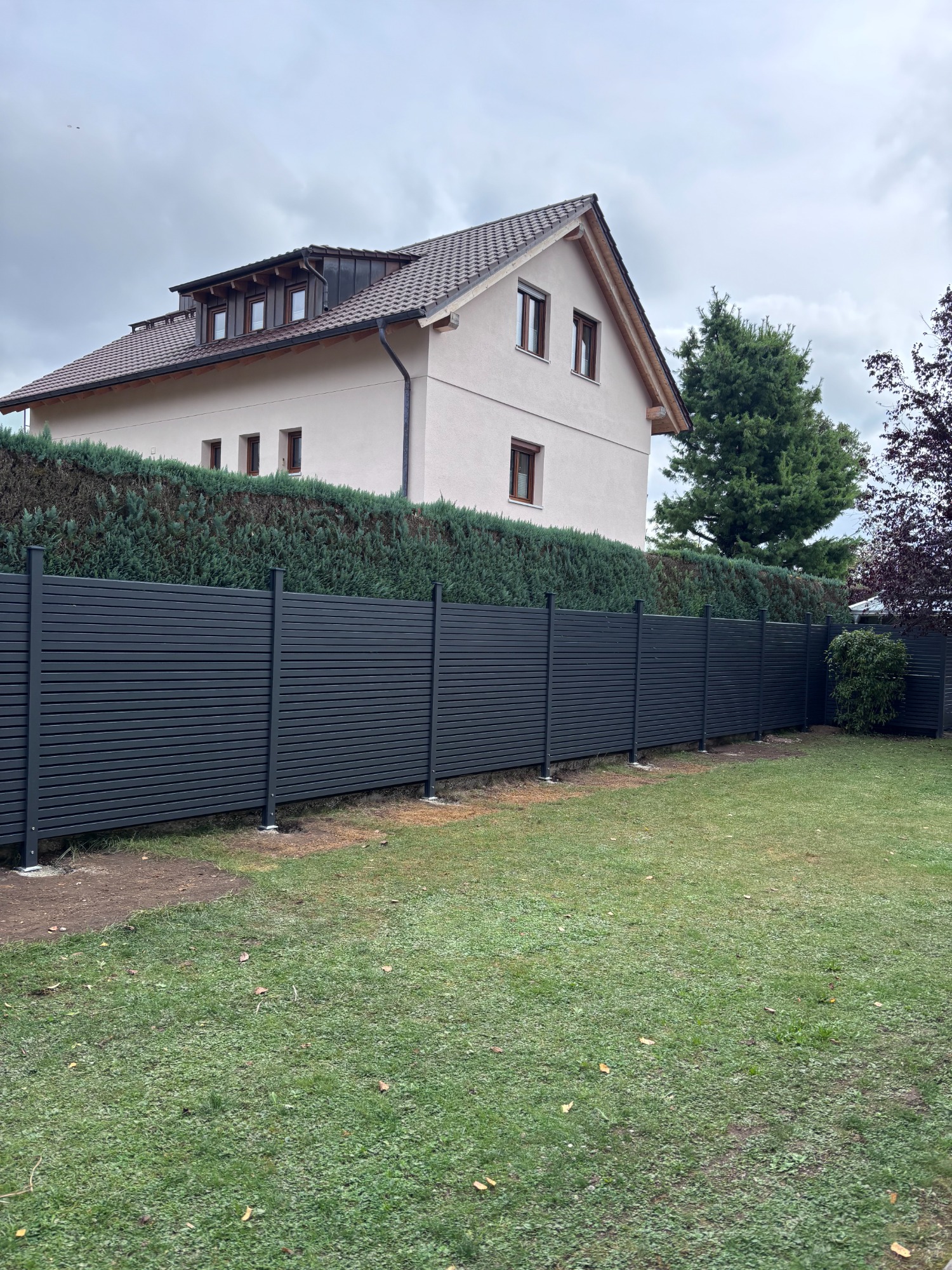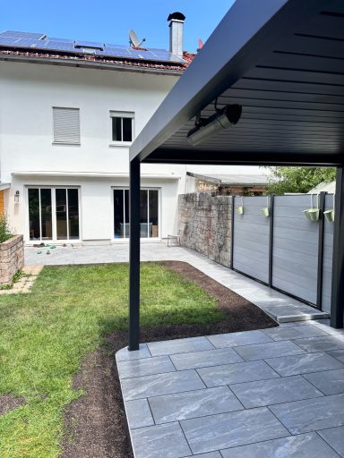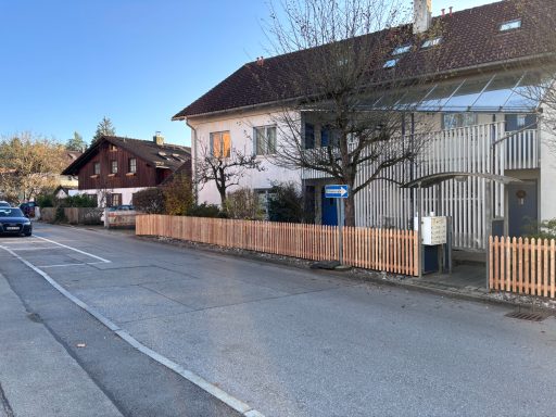 Ein einzigartiger 30 m langer Holzzaun aus schmalen, hochkant montierten Lärchen-Zaunlatten verleiht diesem Grundstück eine moderne und natürliche Note. Das hochwertige Holz stammt vom Sägewerk Holzgar aus der Pupplinger Au im Isartal, wodurch Regionalität und Nachhaltigkeit perfekt kombiniert werden. Als zusätzlicher Blickfang wurde ein stilvoller und funktionaler Mülltonnenstellplatz aus den Zaunlatten integriert. Dieses Projekt vereint Ästhetik, Handwerkskunst und praktische Lösungen auf höchstem Niveau.